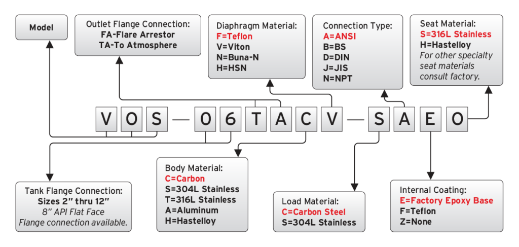 Example: The above order number indicates a Pressure/Vacuum vent with To Atmosphere exhaust. Inlet is 6”, Carbon Steel body, Teflon diaphragm, Weight loaded with Steel weight material, and Factory Epoxy Base Internal Coating.